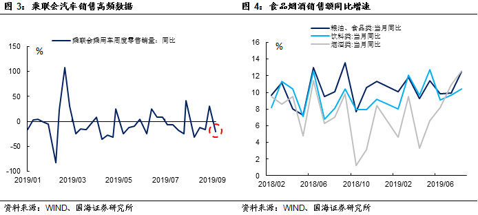 分项来看,汽车销售额增速自6月份反弹后,连续两个月快速下滑,今年以来表现最差。在经济下行压力加大、消费者信心受干扰的大背景下,由于6月份“国五”汽车促销力度较大,目前汽车销售仍然处于促销后的透支期当中。9月是汽车销售的传统“旺季”,但从高频数据来看9月初汽车销售不及预期,“金九”不金可能成为今年秋季车市的现状。部分消费项目受季节性利好的影响。由于中秋节较上年同期提前一周,中秋食品、饮料、烟酒部分需求提前至8月,推动食饮消费同比增速较7月明显上升。如粮油、食品类消费增速较7月提升2.6%;烟酒消费较上个月提升1.7%。受开学季影响,文化办公用品类销售同比增速较上月提升5.4%。服装鞋帽消费企稳,较上个月反弹2.3%。