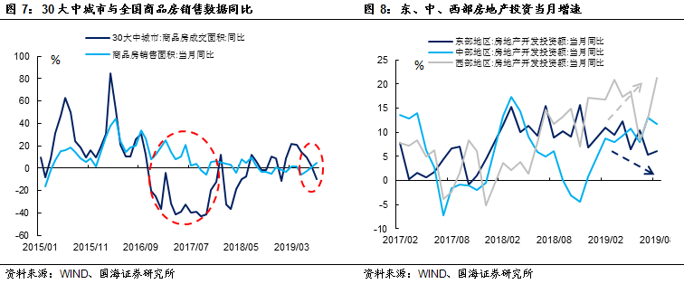 中西部三四线城市地产销售坚挺,支撑8月地产投资增速。1-8月房地产投资累计同比增长10.5%,较上月小幅回落0.1%。但单月来看,8月地产投资增速同比达到10.47%,较7月反弹近2%。国内房地产销售情况出现分化,8月东部大中型城市销售受调控政策影响明显遇冷,30个大中型城市商品房成交面积增速明显下行,落入负增长。但中西部小城市销售情况仍然良好,支撑全国地产销售数据增速回升,与2017年三四线城市棚改时分化的销售数据具有一定的相似性。其中中部地区累计投资增速加快0.3%,西部地区累计投资增速加快0.9%,支撑起本月地产投资增速。