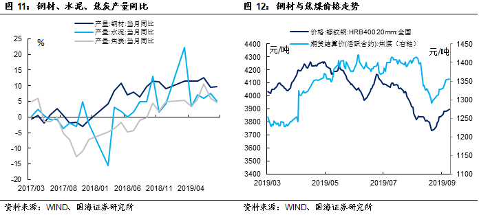 外需下滑拖累8月工业生产数据。8月工业增加值当月同比较上月下滑0.4%。受贸易战影响,出口交货值同比下降4.3%,较上月下滑6.0%,成为拖累本月工业增加值表现的主要原因。在主要工业品产量方面,“国六”政策落地后,汽车厂商补库存推动8月产量同比大幅回升,汽车产量同比较上月上升10.9%。但未来汽车生产数据是否能够持续好转,还需要得到“金九银十”销售数据走强的印证,目前还没有看到销售端回暖的迹象。8月水泥、焦炭产量增速出现下行,钢铁产量相对坚挺。受基建提速以及国庆环保预期影响,上述产品价格在8月底触底反弹,未来价格回升是否会提振生产,一定程度上将受到国庆前环保限产力度的影响。