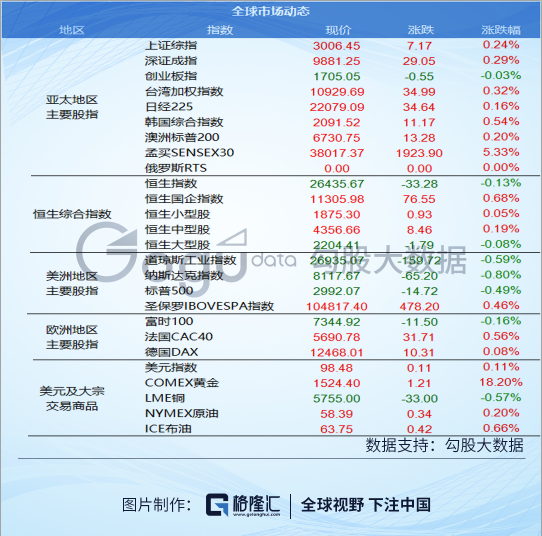 【A股】沪深两市延续窄幅震荡,上证指数收涨0.24%报3006.45点,深证成指涨0.29%,创业板指跌0.03%报1705.05点。两市成交5469亿元。上周三大指数跌幅均在1%以内。北向资金单边净流入,并于尾盘大幅进场,一度流入高达310亿元。全天北向资金净流入148.62亿元,创2018年11月以来单日最大净流入额。但大量资金参与博弈,上海机场、中国国旅等白马集合竞价期间被砸。行业方面,《交通强国建设纲要》印发,相关概念股掀涨停潮,科技股整体仍保持强势,智能穿戴、PCB、软件及半导体各有表现,5G板块整体低迷;军工、旅游、券商发挥欠佳。个股方面,东方中科6连板“成妖”;股王茅台涨1%再创历史新高,平安银行涨近3%同创新高。