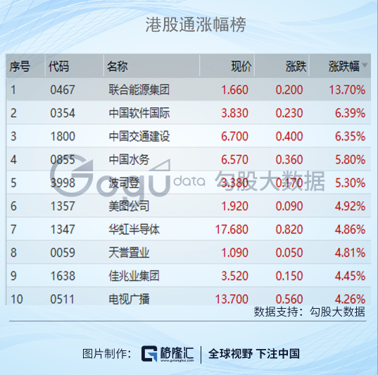 个股方面,中电控股涨2.57%为最佳恒指成份股;华润置地、工商银行、中石化、长和小幅上涨,申洲国际大跌近4%;瑞声跌2.55%;吉利汽车、友邦保险、中国平安皆下挫;高铁基建普遍强势,中国交投建设大涨6.35%领涨国指,中国中铁涨3.37%,中国铁建升3.4%;港股通标的股联合能源集团大涨13.7%。