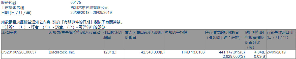 根据港交所最新权益披露资料显示,2019年9月24日,吉利汽车(00175.HK)遭Black Rock, Inc.以每股均价13.0106港元,减持4234万股,总价约5.51亿港元。