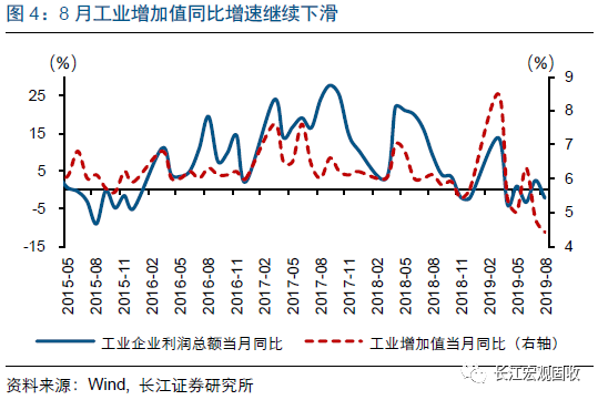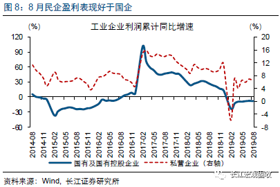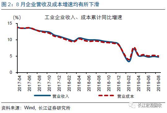 8月盈利增速明显下滑,或受工业生产销售放缓、PPI跌幅扩大等因素影响。8月企业利润总额和营业收入增速下滑,受量、价两个维度因素的共同影响。量的层面,8月工业增加值同比增速4.4%、较前值下滑0.4个百分点,跌至近年单月最低水平;价的层面,8月PPI同比增速-0.8%、较7月跌幅进一步扩大0.5个百分点。此外,8月超强台风等或也对工业企业利润产生一定负面影响。