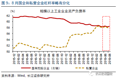分企业类型来看,民企盈利继续正增长、表现好于国企,小型企业盈利也相对较优。1-8月,国企盈利增速-8.6%、跌幅近一步扩大0.5个百分点,私企盈利增速也有回落,但仍然保持正增长、累计同比6.5%;大中型企业盈利增速-5.3%,明显低于工业企业平均水平,反映小型企业盈利相对较好。杠杆率视角来看,8月国企杠杆率提升0.1个百分点至58.4%,私企下滑0.3个百分点至57.8%。