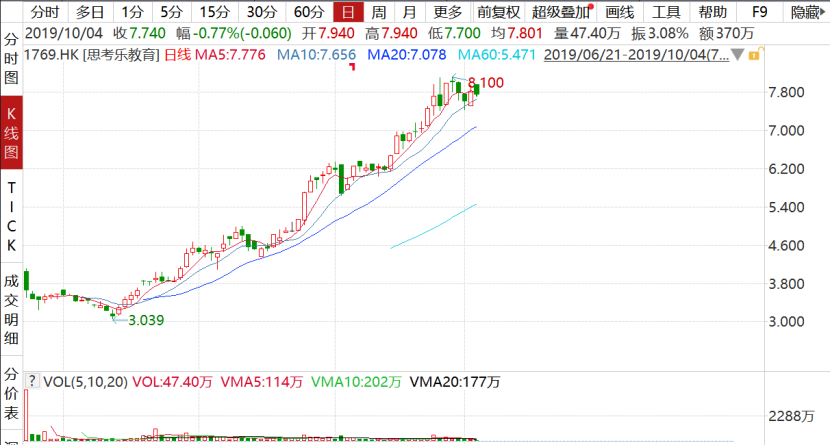 近期以来,港股市场中的一只教育新股——思考乐教育(01769.HK)股价涨势可谓引人瞩目:自6月21日上市以来,三个多月的时间,该公司股价累涨了90.24%,截止发稿总市值为43.01亿港元。