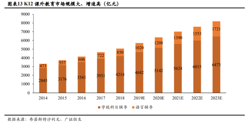 据弗若斯特沙利文显示,2014年全国K12课外教育服务市场的市场规模约3318亿元,2018年市场规模约为5064亿元,复合年增长率达10.52%;预期2023年K12课外教育服务市场规模可达8194亿元,预计复合年增长率为8.74%。