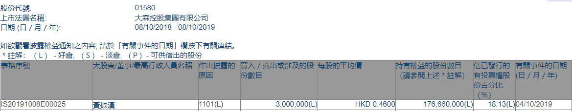 格隆汇获悉,根据港交所最新权益披露资料显示,2019年10月4日,大森控股(01580.HK)获黄振汉以每股均价0.4600港元,增持300万股,总价约138万港元