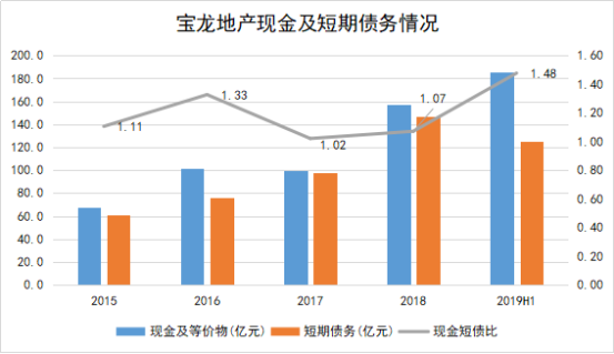 根据2019年中报数据显示,公司的现金在持续增的同时其短期债务正持续下降。截至2019年中期,宝龙地产一年内短期借款为125.4亿,同比下降了14.8%。公司的现金短债比今年并未出现低于1的情况,现金足够完全覆盖短期债务,而近年公司现金短债比持续提升至1.48倍。