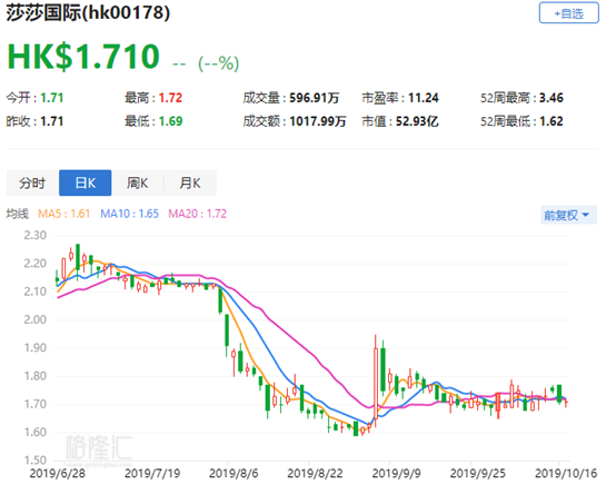 今日莎莎国际盘中震荡至收盘横盘,报1.71港元,最新总市值为52.93亿港元。值得注意的是,公司股票自2018年6月达到高位后一路下跌,截至目前累计跌幅近70%
