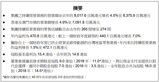 实际上,回顾集团上一个财年的经营状况来看,其业绩早已呈现出疲软状态,据2019财年(截至3月31日)业绩报告显示,全年实现营收83.76亿港元,同比增长4.5%;净利润为4.71亿港元,同比增长7%,但扣除自上一个财政年度已终止经营并录得亏损的台湾地区零售业务,持续性经营净利润则仅同比增长1.5%。而毛利率方面则从42.1%下降至40.8%