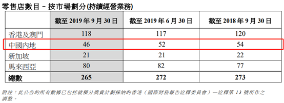 截至2019年9月30日,集团共有零售店265间,其中,香港及澳门地区零售店为118间(增加1间),中国内地零售店为46间(减少6间),新加坡零售店21间(不变),马来西亚80间(减少2间)。