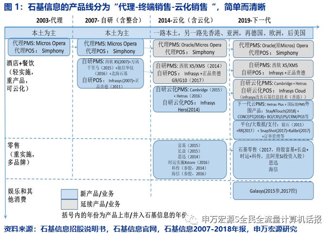 投资者预期是,石基信息产品线之间的发展路径和搭配关系较为复杂。实际上石基信息的产品可以按照“产品代理-终端产品自研及销售-云化产品自研及销售”三步骤,简单而清晰。归纳15年历史如图1。