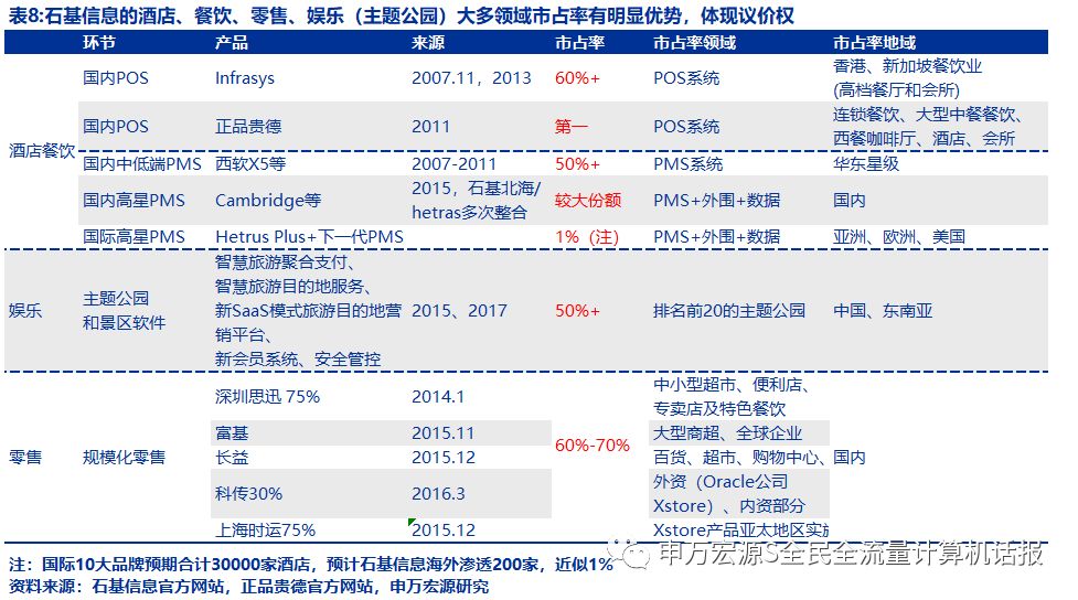 石基信息的定期报告论述壁垒其壁垒为:“在中国星级酒店业信息管理系统市场和规模化零售业(客户年度营业额1亿以上)信息管理系统市场的客户占有率为60-70%,在中国餐饮信息管理系统市场居相对领先地位”。优势不仅如此,我们将其在酒店餐饮POS、酒店餐饮PMS及外围、娱乐、零售的各业务市占率罗列如表7。