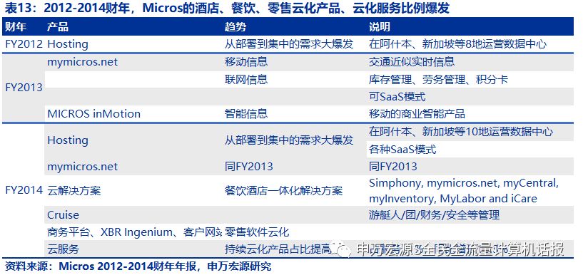 收购前,Micros2012财年指出,“从部署到集中的需求大爆发”。2013财年创新性推出带交通近似实时信息、库存管理、劳务管理、积分卡、礼物卡的SaaS模式的mymicros.net及带商业智能工能的MICROS inMotion。2014财年不光浓墨重彩云化特色的mimicros.net、餐饮零售一体化解决方案、船舶财产管理系统Cruise、零售解决方案,还指出云化服务占比21%,同比增长16.3%。