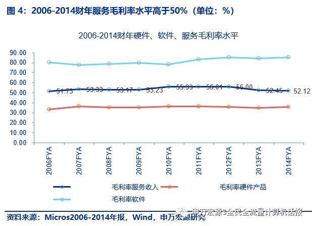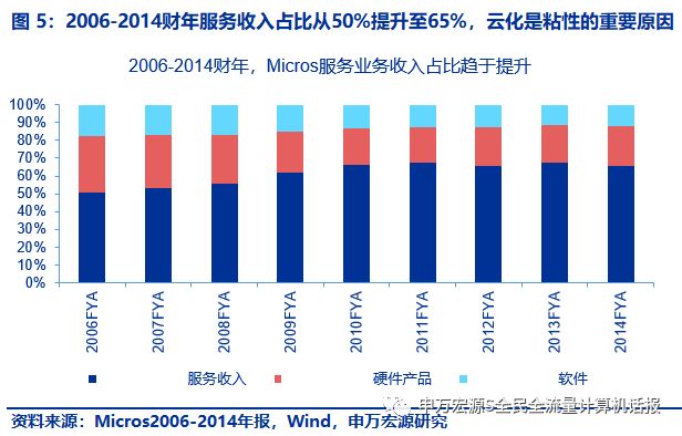 Micros收购前,服务占比超过65%,毛利率超过50%,服务毛利达到29亿元,将是石基信息成功云化后的远景目标。1)2006-2014财年,micros服务收入毛利率50%-56%,收入占比从50%提升至65%,将是石基信息未来的目标。其较高的毛利率来自为全球高端酒店、餐饮、零售客户提供高附加值,其较高的收入占比来自存量累积客户的高粘性。而云化是粘性的重要原因。下图是毛利率与服务收入占比的图表证明。2)2014财年,Micros来自服务的收入、毛利分别为56亿、29亿元(原始披露分别为9.2、4.8亿美元)。