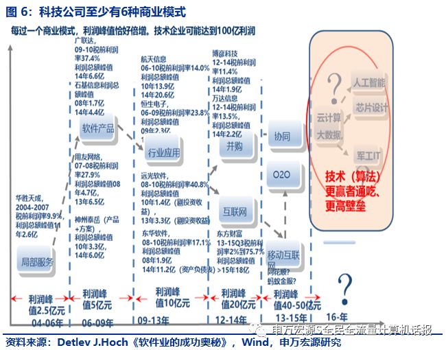 《软件业的成功奥秘》指出了软件公司的商业模式,依次为服务、产品、解决方案、大众市场软件、互联网,每种有不同的发展特征。A股科技公司的商业模式与此对应,为服务、产品、解决方案、互联网、移动互联网、技术 。详见图6。
