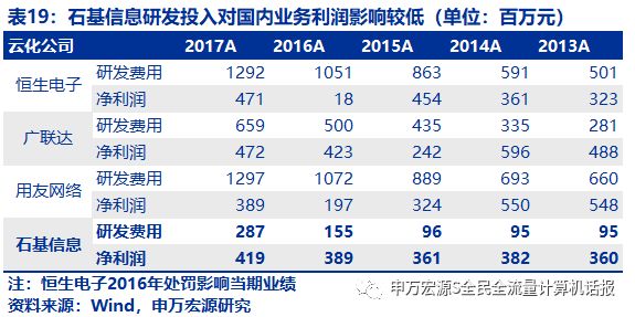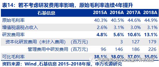 若剔除云化研发影响,“原始毛利率”实际连续4年提升。若将实施与研发计入营业成本,石基信息的“可比毛利率”2015-2018年依次为38.1%、38.0%、37.0%、35.0%,略微下降。但若剔除研发费用影响,“原始毛利率”连续四年提升,详见表14。