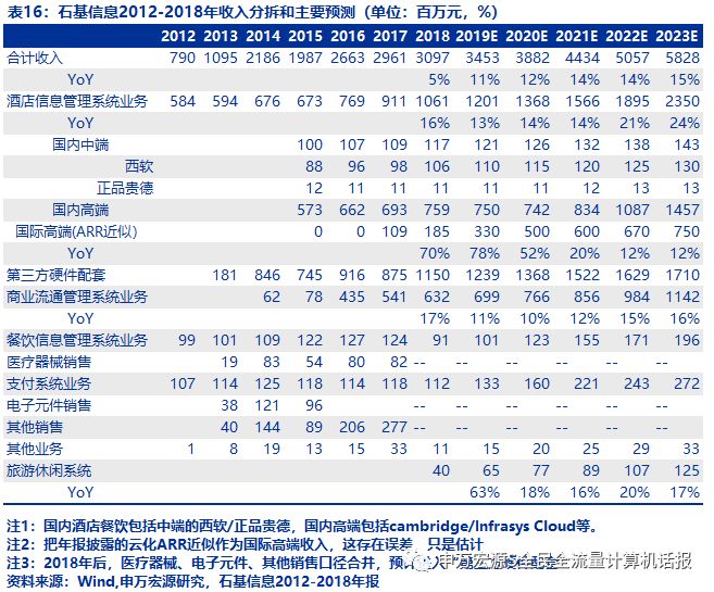 维持2019-2021年收入预测,分别为34.5、38.8、44.3亿元,详见表15。其中酒店信息管理系统服务可以划分为国内中端(西软、正品贵德)、国内高端、国际高端三部分。把年报披露的云化ARR近似作为国际高端收入。这较为公允,即使存在误差。