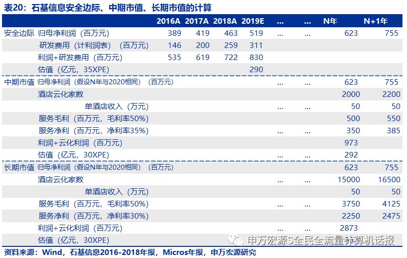 当前安全边际测算290亿元:可加回研发投入计算安全边际,得到2019年修正后利润8.30亿元,35XPE为290亿市值。远期市值目标862亿元:若石基信息取得与Micros类似的行业地位:云化15000家酒店,年化酒店收入50万元,服务费毛利率50%,净利率30%。得到国内外合计利润28.7亿元,选择30XPE,得到862亿元。