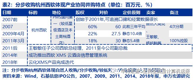 一个案例是杭州西软,2007前、2007-2011、2011-2014、2014-2018分别是独立、收购、高管协同、产品新研发、产品协同的阶段,且交易对手方是自然人而非PE投资者。2007年前,杭州西软已经创立超过6年,有可追溯的口碑和经营数据。2007-2011年,分三次向自然人收购股权。2011年后,标的一位创始人担任公司副总裁,即同时担任子公司和公司整体高管职务。2014年推出西软XMS云PMS产品并2018年完成迭代。