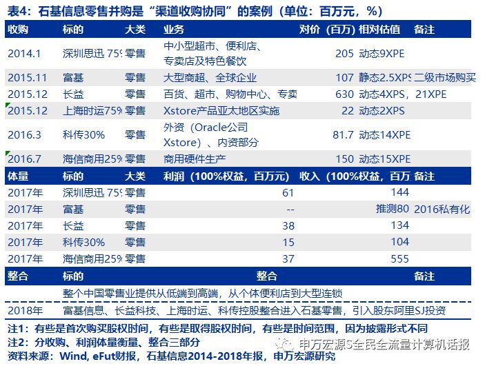 对渠道类并购的话语权之二在于品牌与科技平台支持。石基信息往往将外部资源分享给渠道类标的,例如引入阿里投资。2017年报指出,“2017年,为了更好地整合零售信息系统业务资源,公司对旗下规模化零售行业的子公司进行了重组,将所持旗下从事规模化零售业务的子公司富基信息、长益科技、上海时运、科传控股的股权整合进入子公司石基(香港)的子公司石基零售。2018年2月7日,阿里巴巴集团全资子公司 ALIBABA SJ INVESTMENT LIMITED(以下简称“阿里SJ投资”)与公司全资子公司石基(香港)达成《股份购买协议》,公司将全资子公司石基零售38%的股权以4.86亿美元的价格转让给阿里SJ投资和/或其关联方。2018年4月4日,公司与相关方完成全部股权转让款支付等交割全部事项,阿里SJ投资正式成为石基零售的股东之一,持股比例为38%,石基(香港)持股比例为62%“。表4是案例。