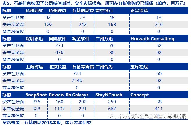 投资者的预期是,石基信息的子公司众多,意味着商誉风险。我们的观点是:1)石基信息的并购全部是产业整合型并购,对价很低,例如3XPS、6XPE,原因是公司对行业议价权。2)在子公司融入后数年,开始产品整合。3)并购包括低风险的产品线协同和渠道互补收购协同。4)主要收购公司的核心管理层已升任中高层,较为稳定。5)详细的商誉测试披露验证极低风险。以上与A股计算机行业绝大多数并购完全不同。