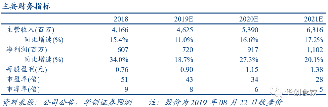 全国化扩张加速,激励力度加大。公司计划2023年实现双百目标,目前进展体现强执行力。1)全国化扩张加速: 19H1东部/南部/中西部/北部区域收入同比+12.13%/11.87%/24.49%/20.78%,经销商总数达到975家,净增加111家经销商,其中中西部、北部分别新增44/55家,其中开发空白地级市15个,全国地级市开发率达81%。全国化扩张进程加速; 2)餐饮渠道实现高增速:公司重新梳理了经销商结构,更新经销商资源投放标准,同时以厨邦厨师俱乐部为平台,通过超级凉菜大奖赛和顶级厨师训练营等专业活动,配合终端推广,实现餐饮渠道快速增长,截止上半年餐饮产品销售同比+41.49%。同时加快电商和出口渠道的拓展,完成了主流直营平台、新零售平台的入驻与开发,出口国增加到了7个;3)产品不断升级:19H1完成了淡盐、小淘气低盐酱油和海鲜、蒸鱼风味酱油的升级,并完成了其它多品类产品的《2019-2023年产品开发初步计划》,加大了产品开发力度;4)激励力度加大:公司加大激励激发员工积极性,体现为收入指标考核权重增加,奖金向中层骨干倾斜,及提升超额奖励提成比等。此外,公司规划建设食品科技产业孵化区,以健康食品为突破口,实现资源整合。