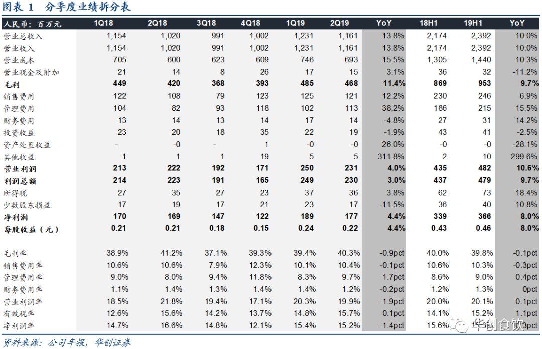 美味鲜收入持续增长,盈利保持稳健。美味鲜19H1营收22.62亿元,同比+15.26%,其中调味品中酱油和酱稳健增长,分别同比+10.44%/12.01%,蚝油、料酒因行业增长及积极拓展持续放量,分别同比+60.93%/65.63%,食用油、腐乳增速超过25%;归属母公司净利润3.62亿元,同比+20.05%。产品综合毛利率达39.61%,同比-0.38pct,主要源于部分原料如谷氨酸、包材等价格处于较高水平,同时非酱油产品占比提升所致,但相比18年仍提升0.41pct;上半年费用率18.79%,同比-0.41pct,其中销售费用/管理费用分别同比+7%/19%,源于销售人员工资待遇、运费及业务费用增长,广告费用未见大幅增加;管理人员薪酬待遇、职工社保费用等亦提升较大,费用率下降拉升净利率至17.64%,同比+0.62pct。单二季度看,美味鲜实现收入10.95亿元,同比+15.26%,归母净利1.76亿元,高基数下同比+7.98%,净利率17.53%,同比-1.31pcts。