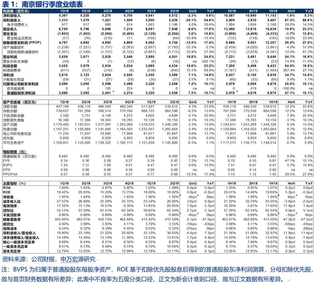 事件:南京银行披露2019年中报,1H19实现营业收入166亿元,同比增长23.3%;实现归母净利润69亿元,同比增长15.1%,符合预期。2Q19不良率季度环比持平于0.89%(监管口径),拨备覆盖率季度环比提升0.1个百分点至415.5%。