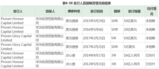 另据募集说明书,华为曾于2015年、2016年和2017年在境外发过四次美元债券,共计45亿美元,均未到期;另外还有两单点心债,共26亿人民币,已完成兑付。而此次发行的两期中期票据,则是华为在境内债券市场的首次亮相。