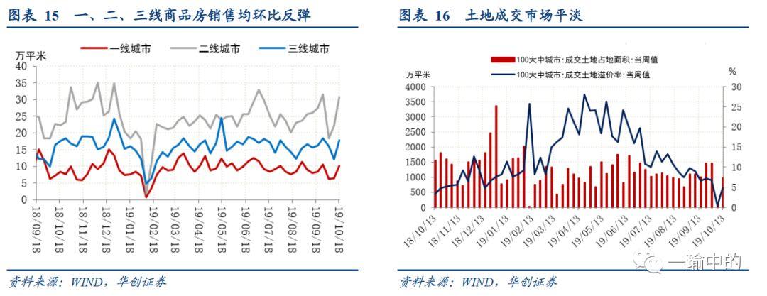 在经历10月上半月的低迷后,上周商品房销售环比大幅反弹(图表15上周(1012-18号)30大中城市商品房日均成交面积58.58万平方米,环比大幅上涨44.32%,一线、二线、三线城市成交量分别环比上升61.39%38.13%46.74%国庆期间土地成交跌至低位,假期后土地成交市场回归前期均值水平(图表16截至1013日,100大中城市成交土地占地面积周度成交985.11万平方米,较国庆前一周下降32.1%(国庆期间土地成交117.73万平,不具有可比性),百城成交土地溢价率报4.82%,较国庆前一周下降1.89个百分点(国庆期间土地溢价率仅为0.49%)。