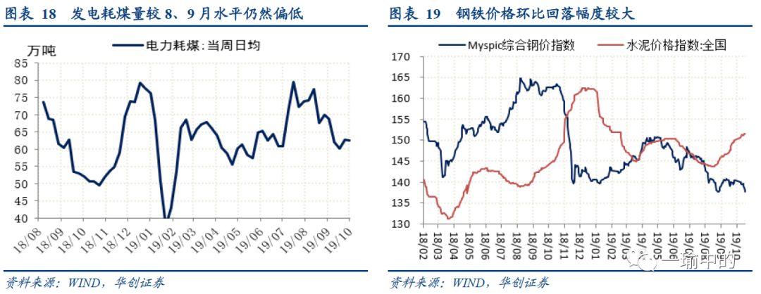 生产端,国庆影响逐渐消失,但生产仍然偏弱,上周6大发电集团日均耗煤量62.55万吨,周环比下降0.45%,由于去年同期的低基数影响,同比上涨23.32%(图表18)。6大发电集团煤炭库存1593.83万吨,环比上涨0.39%全国高炉开工率63.54%,周环比下降0.82个百分点,不考虑国庆影响,相比89月水平仍然偏低。汽车全钢胎、半钢胎开工率分别为71.95%64.80%,环比分别回升13.527.2个百分点。
