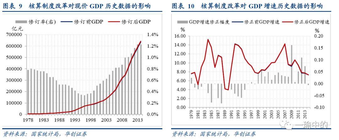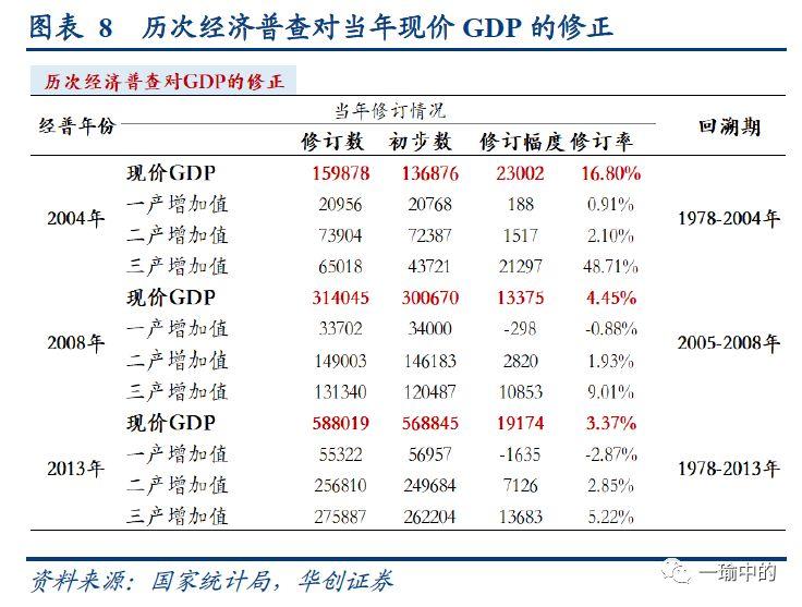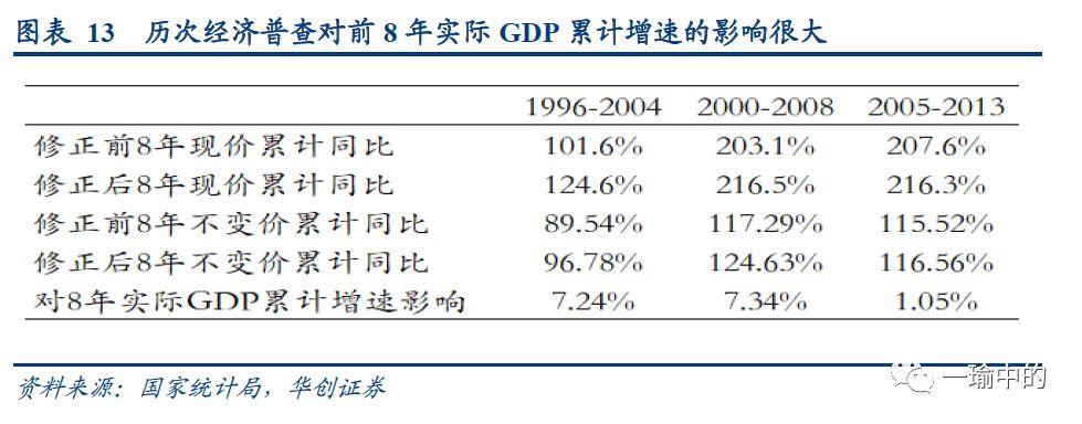 1)经济普查对实际GDP累计增速影响较大。第一次经济普查将1996-2004年这8年的实际GDP累计增速调高了7.24%调整前,8年间的实际GDP累计增速为89.54%,调整后为96.78%第二次经济普查将2000-2008年这8年间的实际GDP累计增速提高了7.34%调整前,8年实际GDP累计增速为117.29%,调整后为124.63%第三次经济普查将2005-2013年这8年间的实际GDP累计增速提高了1.05%调整前,8年实际GDP累计增速为115.52%,调整后为116.56%(选取8年作为观察窗口,是为了与2010-2018年的时间段相匹配)。