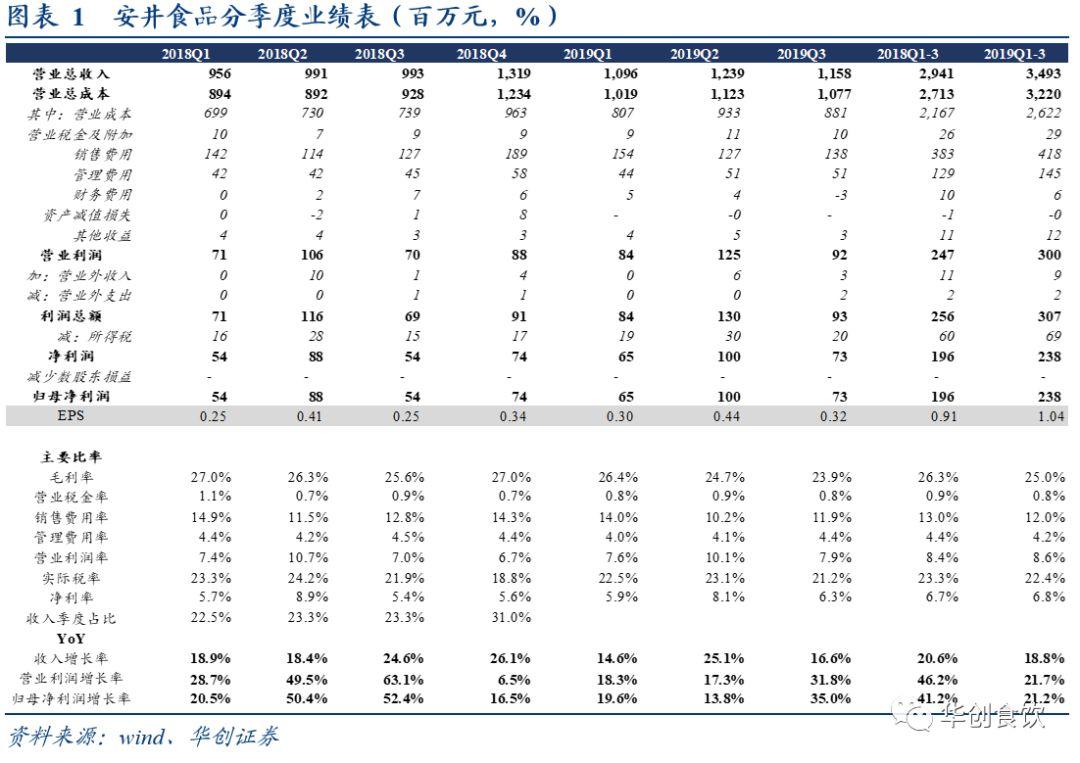 收入表现持续稳健,产品结构调整良好。分产品来看,2019Q3公司面米制品收入3.24亿元,同增19.1%,鱼糜制品收入4.29亿元,同增20.6%,菜肴制品收入1.37亿元,增速30.3%,延续上半年良好增长趋势,多款大单品持续发力。肉制品收入2.66亿元,同增2.8%,较H1增速(+4.93%)有所下降,公司针对猪价上涨主动调整产能结构,降低肉制品占比。分渠道来看,2019Q3经销商渠道收入10.17亿元,同增15.3%;商超渠道收入1.05亿元,同增23.6%,上半年商超提前对账影响消除,环比提速;Q3电商渠道收入904万元,同增600.7%,主要系京东自营销售规模扩大。分区域来看,19Q3华北、华南、西南地区较快增长,同增37.3%/59.4%/47.6%,辽宁及四川工厂扩产辐射效应明显;东北地区Q3同减22.6%,H1高增后属阶段性区域政策正常调整。2019Q3末经销商数量668家,较年初增长50家,Q3华东、西南、华中地区招商效果良好,经销商数量分别增加10/10/8家。