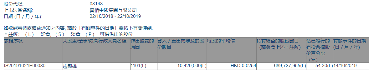 【增減持】奧栢中國(08148.HK)獲趙毅雄增持1042萬股
