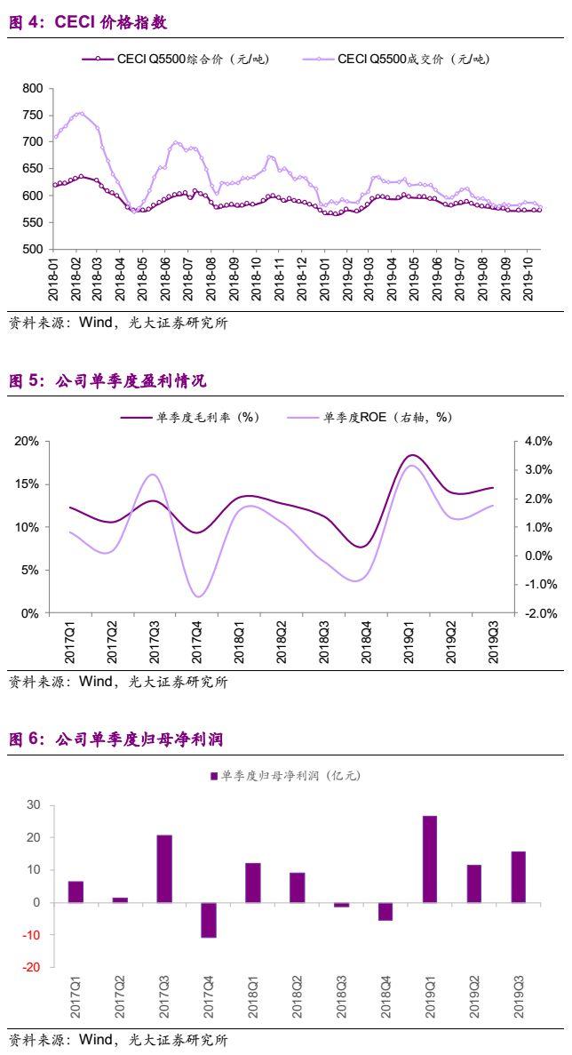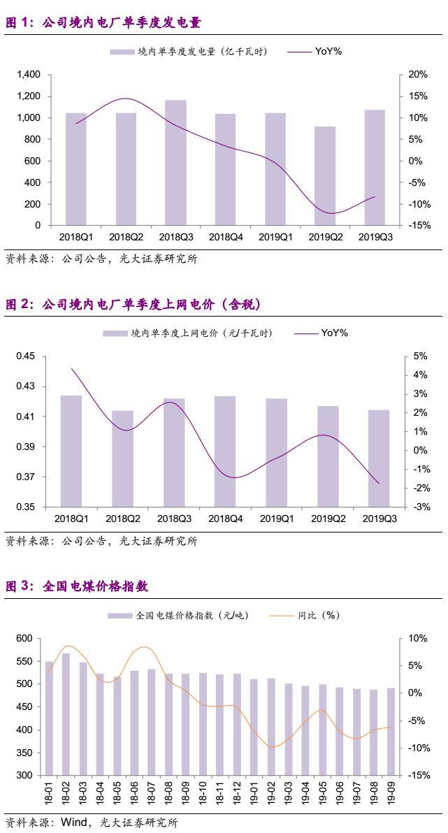 电量方面,受部分区域电力需求下滑、控煤、外来电增长等因素影响,2019年前三季度公司境内电厂发电量3022亿千瓦时,同比下滑7.5%。分季度看,2019Q3公司境内电厂发电量1068亿千瓦时,同比下滑8.3%,降幅较2019Q2收窄3.6个百分点;环比增长16.7%,增速较2018Q3提升4.5个百分点。电价方面,2019年前三季度公司境内电厂平均上网电价0.418元/千瓦时,同比小幅增长0.1%。我们测算2019Q3公司境内电厂平均上网电价约0.414元/千瓦时,同比/环比分别下滑1.8 / 0.6个百分点,我们认为主要原因为市场化交易电量比例提升。2019年前三季度,公司境内电厂市场化交易电量比例51.2%,同比提升10.9个百分点,较2019H1亦增加4.2个百分点,电力市场化比例进一步提升。我们认为,在“基准价+上下浮动”的市场化机制公布后,二级市场对于电力股2020年的盈利预期过于悲观,实际影响仍有待进一步跟踪和观察。