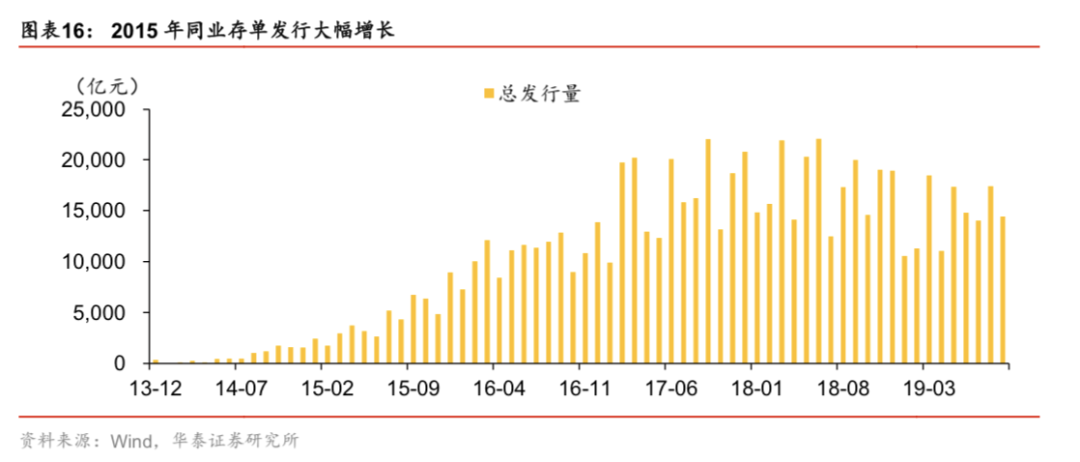 2019年5月,由于严重的信贷风险,监管机构接管了包商银行,打破了同业刚兑。如前面所说,同业业务是中小行进行扩张的重要途径,同业负债是中小行负债端的重要组成和资产端经营的保障。包商银行事件的最直接影响就是包商银行等中小行同业存单发行环境恶化,同业存单发行减少。