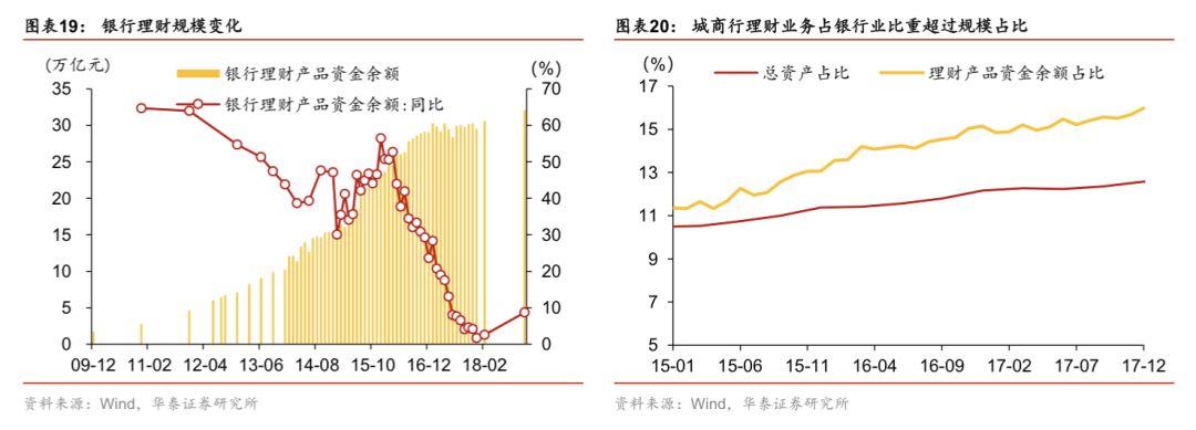 在2014年后,同业理财进入快速增长期,债券市场出现了牛市,在这一背景下,银行理财出现了新的扩张模式,城商行等中小银行通过同业理财吸收大行的资金,投向非银领域,进行债券加杠杆套利或是拉久期信用下沉。这一模式在监管套利的同时,形成了多层嵌套,也暗藏了资金空转、易受流动性冲击等风险。截止2017年末,城商行总资产规模占银行业比重仅为12.57%,而城商行的理财产品资金余额占比达到了15.98%。
