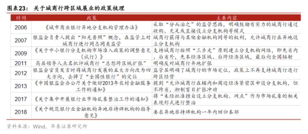 城商行和农商行的异地展业受到限制,对其规模、利润以及风险管理方面都带来不小的压力。2017年,银监会印发《关于集中开展银行业市场乱象整治工作的通知》,将“未经批准擅自设立分支机构、网点”作为市场乱象的相关表现形式进行整治。2018年1月,银监会颁布《关于进一步深化整治银行业市场乱象的通知》持续将“未经审批设立机构并展业”纳入违法违规范畴进行整治。2018年12月29日,银保监会发布《关于规范银行业金融机构异地非持牌机构的指导意见》,要求异地非持牌机构一年内回归本部。2019年1月14日,银保监会发布《关于推进农村商业银行坚守定位强化治理提升金融服务能力的意见》,该《意见》明确,农村商业银行原则上机构不出县(区)、业务不跨县(区)。