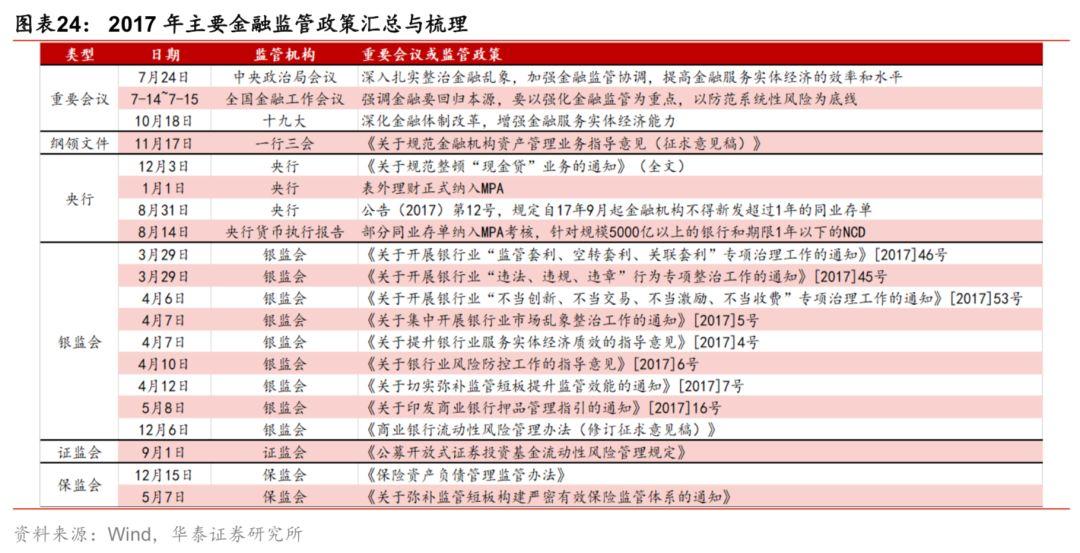 2017年以来监管收紧,由同业业务所产生的资金空转、监管套利等问题是监管的重点,城商行的同业业务和理财业务出现了明显收缩。2017年里,监管陆续出台了一系列收紧政策,金融强监管和去杠杆对资金配置逻辑产生了根本性转变,货币政策中性+宏观审慎监管框架下,流动性充裕的状况不再。银监会“4号文”、“6号文”、“7号文”、“46号文”和“53号文”要求银行去嵌套,限制银行被动负债,减少银行存款派生渠道;MPA考核与银监会“6号文”限制银行同业业务和表外理财,限制银行主动负债能力。