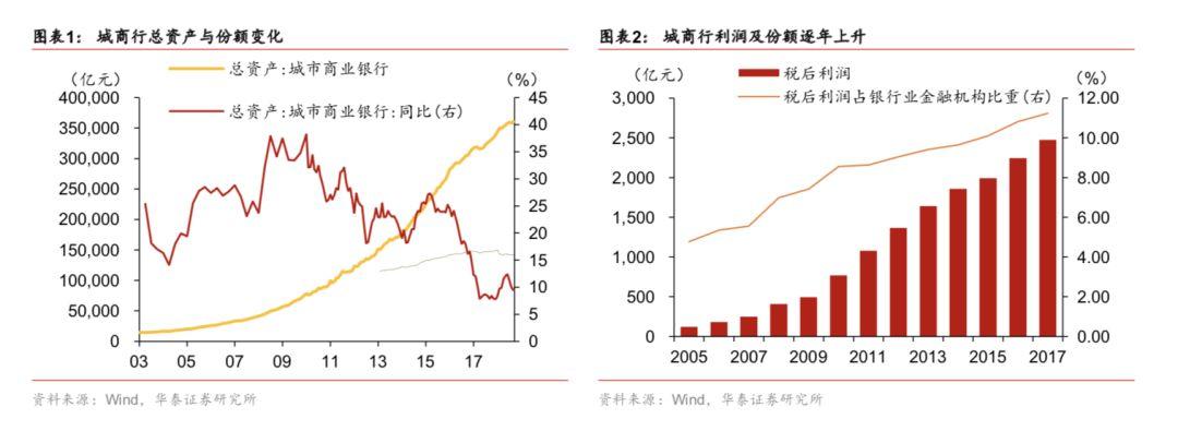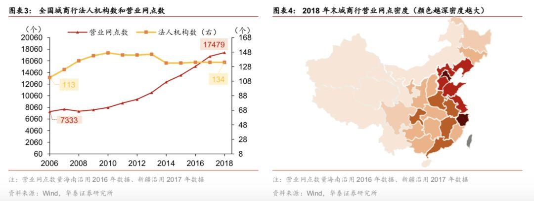 自1995年第一家城市商业银行成立至今,城商行已经历了20余年的发展历程,虽时间不长,但城商行扩张迅猛,已经成为商业银行体系中非常重要的一员。2003年底城商行的总资产规模为14621.70亿元,到了2013年底增长至151778.00亿元,平均每年翻一番,截止2019年6月,城商行的总资产规模达到358772.00亿元,年平均增长率为21.42%。从盈利能力看,从2005年至2017年,城商行净利润从120.90亿元上升至2473.50亿元,年平均增长率28.60%,净利润占银行业金融机构的比重从4.77%提升到11.24%。从数量上看,从2005年到2018年,除港澳台以外全国31个省及直辖市的城商行法人机构数由113个增加至134个,营业网点数由7333家增加至16846家,平均每个县区(地市)约5家。城商行在营业网点分布上,也表现出和区域经济发展状况较强的相关性,一线城市、东南沿海的营业网点明显更多。