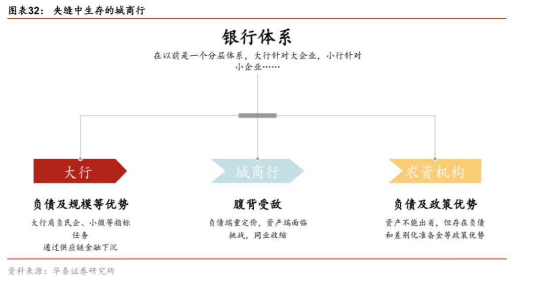 纵观城商行的诞生、扩张和步入寒冬的起起落落,城商行扩张过程中的“利器”如今大多失去了锋芒,可谓是“腹背受敌”,身陷夹缝之中。从整个银行体系来看,以前是一个分层体系,大行主要针对大企业开展业务,中小银行满足中小微企业的主要需求。现在,经济下行压力较大,小微企业融资难,信用风险蔓延,在这样的背景下,大行在政策鼓动下也肩负起了中小企业的融资指标任务,而农商行等农资机构存在负债和差别化准备金等政策优势,城商行在这一时期显得黯然失色。从业务来看,刚兑打破后负债端重新定价,资产端面临来自信贷需求不振、大行竞争等多方面的挑战,同业、理财等金融市场业务也难以“另辟蹊径”,监管持续收紧,城商行不得不承受较大的缩表压力。