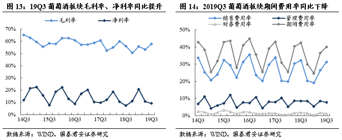 葡萄酒板块毛利率与净利率同比改善。2019Q3葡萄酒板块毛利率57.8%,同比+1.8pct、环比+4.5pct;净利率9.1%,同比+1.8pct、环比-1.6pct;期间费用率40%,同比-2.3pct,环比+3.6pct,销售费用率31.3%,同比-0.9pct,环比+4.9pct,管理费用率7.6%,同比-0.8pct、环比-0.9pct。