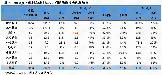 2019Q1-3乳制品板块收入、利润均保持两位数增长。受益消费升级和渠道下沉,乳制品板块收入、利润保持双位数增长。2019Q1-3乳制品板块收入1002亿、净利润65亿,同比增11.3%、10%,增速同比+0.2pct、4.3pct。板块毛利率36.2%,同比、环比均略降。销售费用率同比-0.9pct至23.3%,净利率同比-0.1pct至6.5%,但考虑到行业持续的促销战和价格战,未来销售费用率下降空间不大。