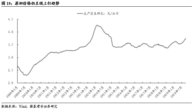 2019Q3收入依旧上升,净利润维持增长。2019Q3乳制品板块收入增11.4%,增速同比、环比+4pct;净利增6%,增速同比+7.3pct。板块毛利率34.7%、同比-0.3pct;净利率5.9%、同比-0.3pct。板块销售费用率达22.4%,同比降1.6pct。