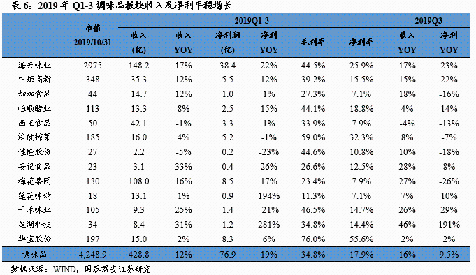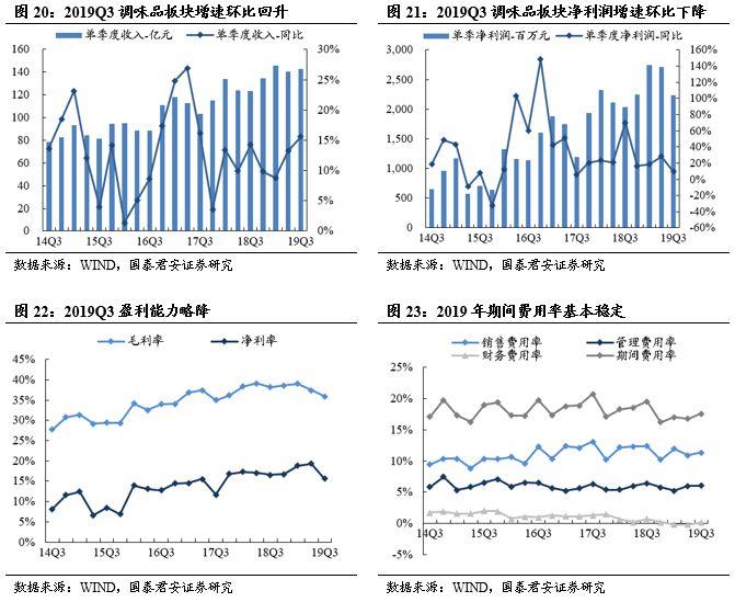 调味品板块收入平稳,高基数影响利润增速放缓。2019Q1-3调味品板块入429亿元,增长12.4%,增速同比-5.1pct;净利润77亿元,增19%,高基数下增速降29.4pct。2019Q3收入143亿、净利润22亿元,同比增长15.6%、10%,增速较2018Q3升1pct、降60pct。
