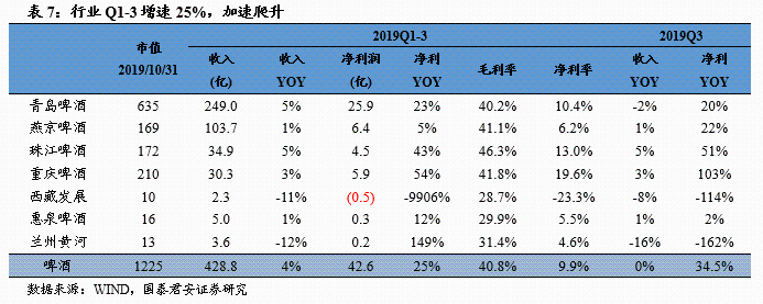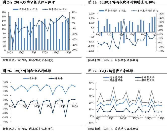 啤酒:降税降费释放利润弹性。2019Q1-3啤酒行业收入429亿、净利润42.6亿,增3.9%、25%。2019Q3收入152亿,净利润16.79亿,降0.1%、升34%。