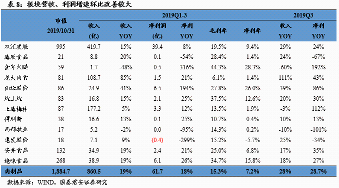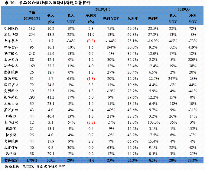 收入及利润增速环比提升。2019年Q1-3食品综合板块收入509亿、增27.5%,净利润41.6亿元,增23.2%。2019Q3板块收入、净利润增长27.5%、27%,增速同比+15pct、44pct,增速环比提升明显。
