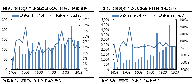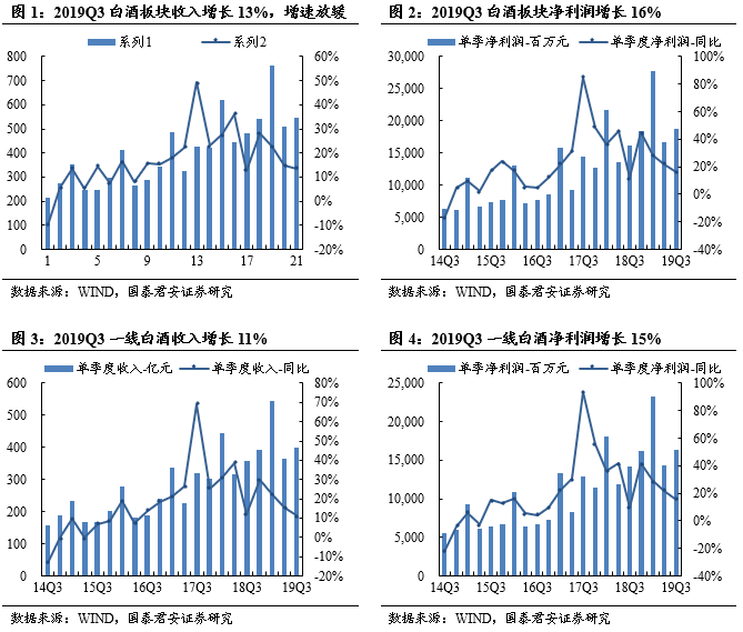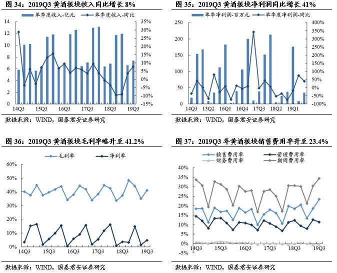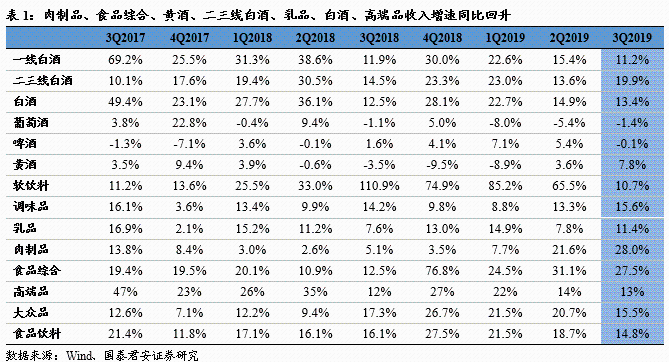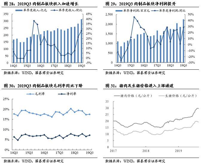 2019Q1-3食品饮料板块收入、净利润5803亿元、983亿元,增18.4%、19%,增速升2pct、降7pct,净利增速有所下滑。2019Q3食品饮料板块收入、净利润1921亿元、296亿元,增14.8%、增15.3%,增速降1pct、升4pct,板块收入及净利仍维持快速增长,利润增速提升。具体上看,Q3单季度肉制品、食品综合、黄酒、二三线白酒、乳品、白酒、高端品收入增速同比提升23、15、11、5、4、1、1pct。