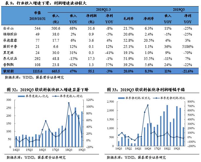 2019Q1-3短期需求承压。2019年Q1-3软饮料板块收入684亿元、增47.1%,增速降8.48pct,净利润54.5亿元、降3%,增速降59pct。板块收入上升主因白云山和香飘飘增幅明显。2019Q3板块收入增长10.7%,净利降22%,其中黑芝麻利润降幅较大,同比-70%,国投中鲁利润大增主要系政府补助大幅增加。2019Q3板块毛利率升1pct至24.6%,板块销售费用率升1.4pct、管理费用率降0.7pct。板块净利润率降1.9pct至4.7%。